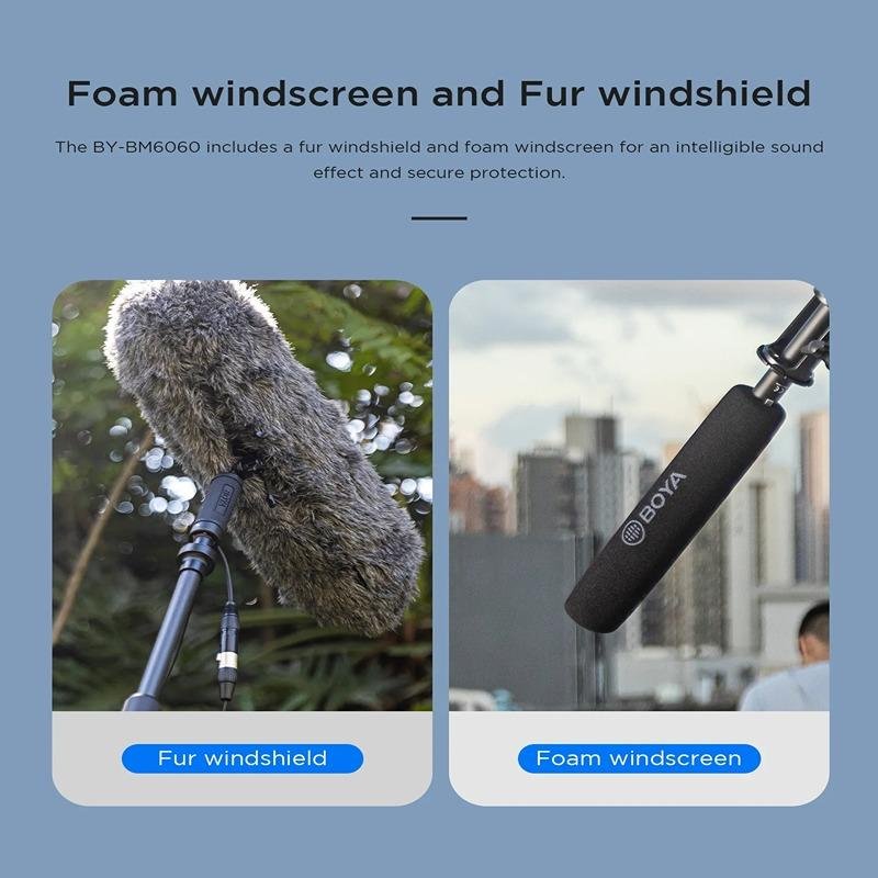 The Boya BY-BM6060 Super-Cardioid Condenser Microphone is designed for high-quality audio capture in professional settings such as film production, broadcasting, and field recording. Its robust alloy-aluminum construction ensures durability while maintaining a lightweight design, making it easy to carry and use in various environments. The super-cardioid polar pattern allows for focused sound capture from the front, reducing noise from the sides and rear. With a frequency response range of 60Hz to 20,000Hz, it accurately reproduces both low and high frequencies, providing clear, natural sound. The microphone features a switchable high-pass filter at 150Hz, helping to eliminate unwanted low-frequency noise such as wind or handling vibrations. It can be powered either by 24-48V phantom power or a 1.5V AA battery, offering flexibility for different setups. Ideal for both indoor and outdoor applications, the Boya BY-BM6060 comes with essential accessories, including a fur windshield for wind protection, a foam windscreen for noise reduction, a shock mount adapter to minimize vibrations, and a zipper bag for easy storage and transport. This microphone is perfect for capturing detailed sound in various professional scenarios, providing reliable performance in a compact, durable package.