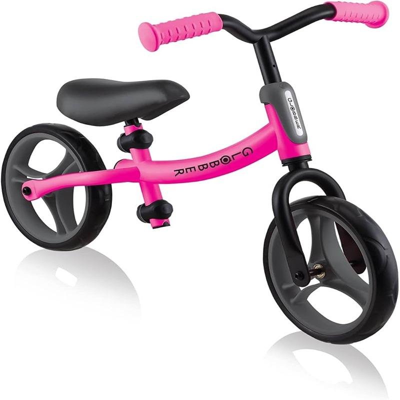 The GLOBBER 10" GO BIKE in Neon Pink is an innovative balance bike designed to help toddlers aged 2-5 years develop essential coordination, balance, and motor skills. This balance bike features a well-engineered 2-stage reversible steel frame that grows with your child. The low frame position is ideal for younger toddlers, allowing them to develop their balancing skills, while the high frame position offers continued use as they grow older. The bike is highly adjustable, with an 8-height adjustable saddle made of soft, comfortable PU material, ensuring a perfect fit as your toddler grows. The curved metal handlebars are also adjustable, offering two height options with ergonomic TPR grips for a secure and comfortable ride. Designed to support up to 20kg, the GLOBBER GO BIKE is built for durability, featuring a robust steel frame that provides stability and safety. It’s equipped with 215mm (8.5”) EVA foam wheels, which offer smooth, puncture-free rides on a variety of surfaces. The Neon Pink color gives the bike a vibrant, eye-catching look, making it both fun and stylish for young riders. Whether your toddler is just starting out or refining their balance, this bike is the perfect tool for learning and building confidence. With its strong frame, smooth wheels, and adjustable features, the GLOBBER 10" GO BIKE is a reliable and safe choice for toddlers to develop their motor skills while having fun.
