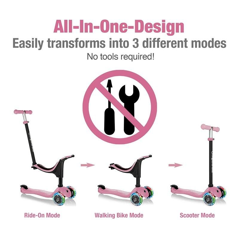 The GLOBBER GO•UP SPORTY LIGHTS SCOOTER in Pastel Pink is the perfect multi-functional ride for your growing child, designed to evolve alongside them from toddler to kid. This 3-wheel scooter offers a seamless transition between ride-on, walking bike, and toddler scooter modes, catering to kids from 15 months to 7+ years. In ride-on and walking bike modes, it's ideal for toddlers aged 15-36 months, while the scooter mode suits children aged 3-7+. The scooter features a patented steering lock system, making it easy for toddlers to learn to steer, and ensures maximum safety during the early stages of riding. The adjustable seat and T-bar grow with your child, providing long-lasting use. The sturdy, durable deck ensures stability and comfort, while the LED light-up wheels add an extra layer of excitement. With no batteries required, the light-up feature provides a magical touch with every roll. Crafted with 35-38% Global Recycled Standard (GRS) plastic, this scooter promotes sustainability and helps create a circular economy by using recycled materials such as bottles, cups, fish nets, and old toys. The GLOBBER GO•UP SPORTY LIGHTS is not only a great choice for your child but also a step towards reducing environmental impact. Recognized by The National Parenting Center with the Seal of Approval, this scooter ensures your child’s safety, fun, and eco-conscious play. Designed for endless playdates and endless fun, this scooter is a reliable companion for both outdoor adventures and everyday rides.