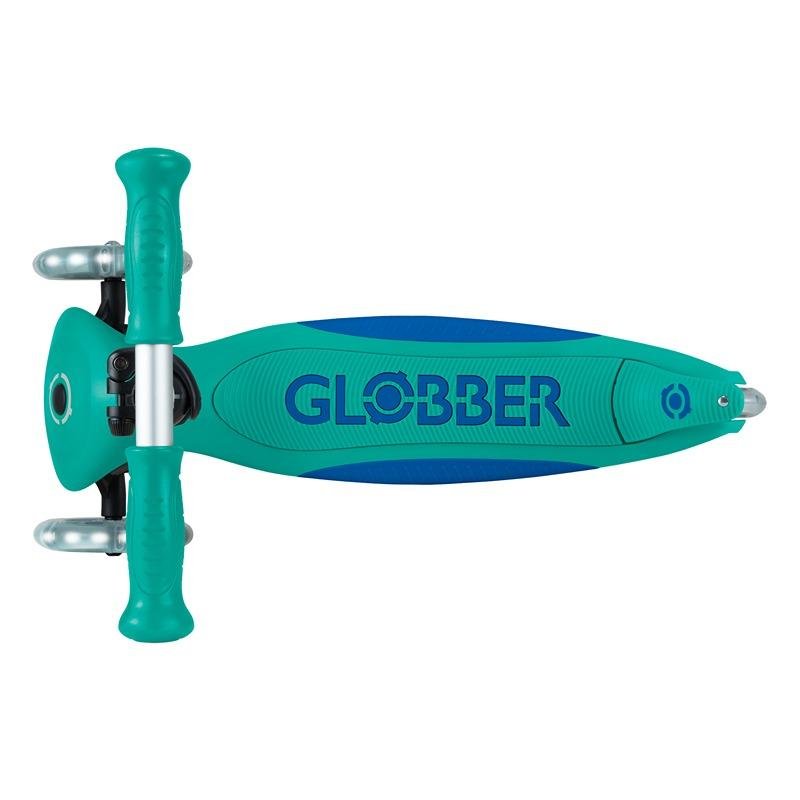 The GLOBBER PRIMO FOLDABLE PLUS LIGHTS scooter in Emerald Green/Navy Blue combines fun and functionality, offering a durable and exciting ride for children aged 3-7+. This three-wheel scooter features vibrant LED light-up wheels that flash in red, green, and blue, creating a glowtastic effect that brightens as your child rides faster. Powered by a dynamo, the lights require no batteries. The scooter is equipped with a patented folding system that allows for easy storage and portability, simply by pressing a button located at the bottom of the steering column. The three-height adjustable T-bar is made of anodized aluminum, providing comfort and convenience as the scooter grows with your child. The ergonomic TPR handles ensure a secure and comfortable grip for little hands. The scooter also comes with a patented wheel lock button, which locks the front wheels to forward and backward motion, helping children focus on balancing. Once they master this, the button can be unlocked, allowing for lean-to-steer turning. Built for durability, the scooter includes a reinforced metal structure, a non-slip, two-color composite deck, and an extra-wide brake for enhanced stopping power. Capable of supporting up to 50 kg, this scooter is perfect for everyday play and outdoor adventures, offering both safety and excitement for young riders.