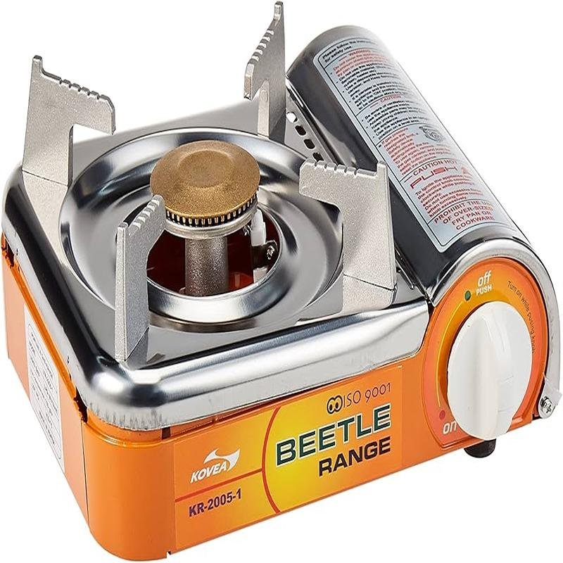 The Kovea Beetle Range (KR-2005-1) is a compact and highly efficient butane mini gas stove designed for both indoor and outdoor use. It features an international patent gas connector, which ensures safety and reliability in its operation. A standout safety feature is the built-in reset button that automatically shuts off the gas supply if the pressure increases, preventing accidents. The stove’s design includes a safety bar for added protection, while the one-touch ignition system ensures easy and reliable starting. The adjustable flame power control allows for precise cooking, making it ideal for various cooking needs, whether you're on a camping trip or cooking indoors. The removable top plate makes it easy to clean, enhancing the user experience. With its ultra-small size, lightweight design, and stylish look, the Kovea Beetle Range is an excellent option for anyone looking for a portable, efficient cooking solution. It uses butane as its fuel, with nozzle-type gas canisters for added convenience. The stove is not only different in size and style from ordinary gas ranges but also offers high performance and functionality in a compact package. Whether you're preparing a quick meal or cooking outdoors, this stove provides the reliability and efficiency you need.