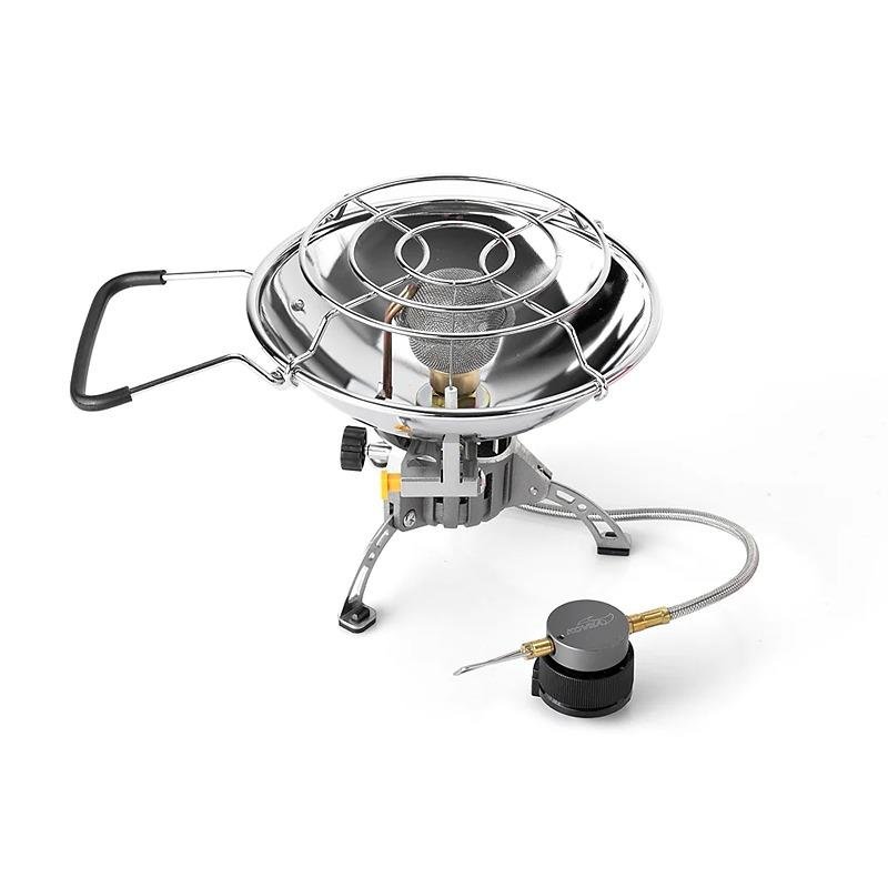 The Kovea FIREBALL HEATER - KH-0710 is a versatile, portable gas heater designed for outdoor enthusiasts who require both heating and cooking capabilities in one compact device. With its unique design, the Fireball Heater features a hose for easy operation and piezo ignition for reliable and safe lighting. The heater offers two reflector positions: an inclined position for efficient heating and a horizontal position for cooking, with both positions securely fixed by a fastening bolt to prevent accidental shifts. This makes it ideal for outdoor cooking, such as boiling water or preparing meals in a mug or small pot. The dense reflector grid ensures optimal heat distribution for cooking even in small containers. Additionally, the Fireball Heater is equipped with an Anti-Flare System, a gas preheating mechanism that helps maintain stable performance in cold weather. Weighing only 565 grams, this portable heater is perfect for camping, hiking, and emergency situations, offering both warmth and the ability to cook in one compact unit. Whether you're heating a small tent or preparing food outdoors, the Kovea KH-0710 provides reliable and efficient performance in any environment.