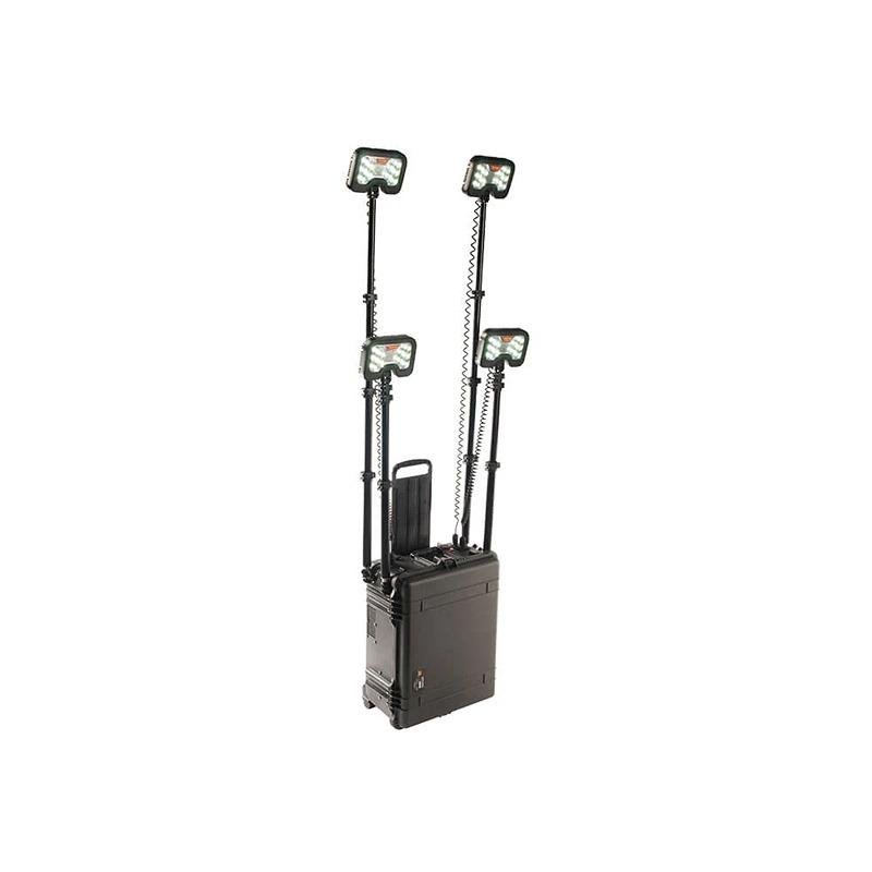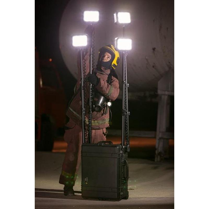 The Pelican 9470M Remote Area Lighting System (RALS) is a cutting-edge lighting solution designed for mobility and versatility, making it ideal for various outdoor and emergency applications. Engineered with a robust set of XL wheels, the 9470M ensures easy transport over rough terrain, allowing users to take powerful lighting wherever needed. This innovative system utilizes an Intelligent Control System that not only calculates and displays current battery life but also enables users to adjust light intensity, select desired run times, or choose from three pre-set power levels. The 9470M features four telescopic masts that extend to nearly 6 feet, each equipped with 360° articulating light heads, delivering an impressive total output of up to 24,000 lumens (6,000 lumens per light head). For extended use, the system can operate continuously on wall power, ensuring you are always prepared. The unit is housed in a durable Pelican case, making it compact and easy to transport. It includes a multi-terrain trolley with a retractable pull handle and stainless steel ball-bearing 1.5-inch polyurethane wheels for smooth mobility. Additionally, the 9470M is equipped with a 12-volt power port and a dual USB adapter, providing power for various peripheral devices. With features such as silent operation, cool operating temperatures, and no exhaust emissions, the 9470M is both environmentally friendly and user-friendly. It also includes full-time battery level indication with a low-level flashing indicator, ensuring you are always aware of your power status. The Pelican 9470M is RoHS and CE compliant, making it a reliable choice for those seeking a powerful, portable lighting solution.
