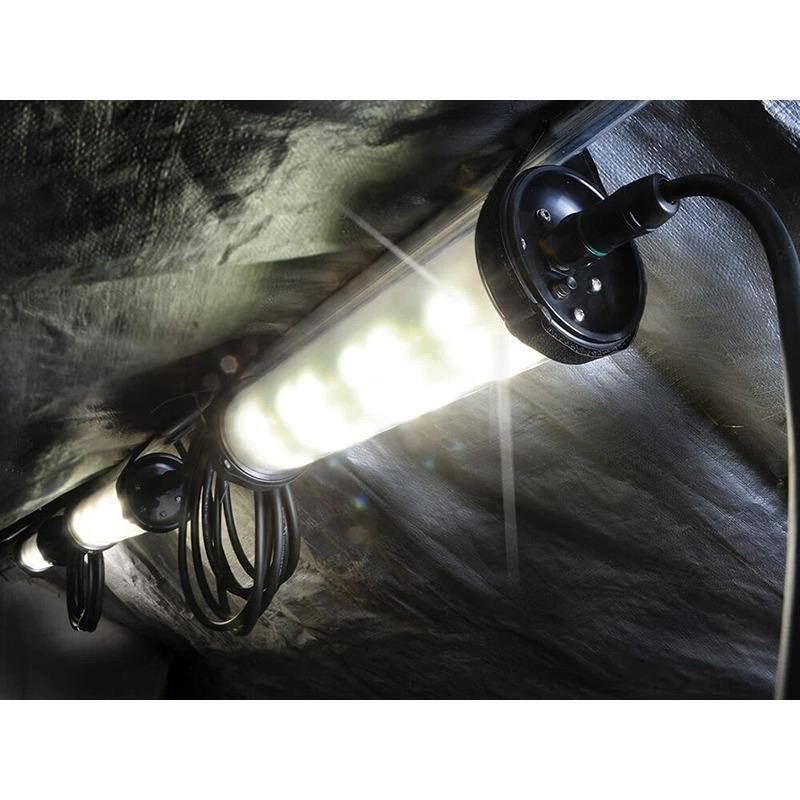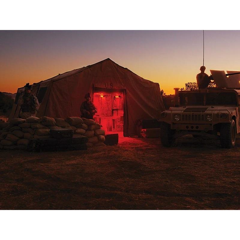 The Pelican 9500 Shelter Lighting System is designed to provide safe, secure, and silent interior lighting for various shelter environments. This advanced lighting solution features three LED light heads, each equipped with both white and red LEDs, ensuring maximum visibility while also preserving night vision when necessary. Each light head generates an impressive 2,000 lumens of white light, totaling 6,000 lumens, and 400 lumens of red light, amounting to 1,200 lumens collectively. The system is built to withstand rugged conditions and can be deployed quickly, making it ideal for emergency and tactical applications. It includes a universal transformer, an inline switch for easy operation, and fixing straps for straightforward mounting. The light heads are interconnected and secured with hanging straps, allowing for flexible installation within the shelter. Users can easily switch between red and white light using the inline switch, and each light head can be independently controlled. The Pelican 9500 can be powered by various sources, including 110-240v AC wall power and 12-30v DC options, making it versatile for different settings. Unlike traditional glass light tubes, the 9500's light heads are virtually indestructible, ensuring durability in demanding environments. The system is housed in a Pelican™ Protector Case™, ensuring protection and compliance with RoHS and CE standards.