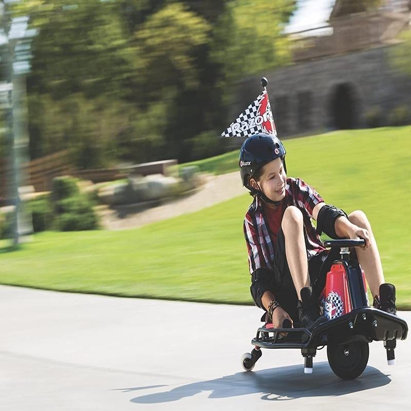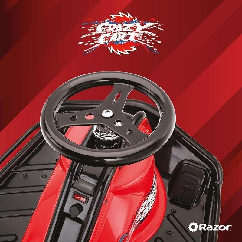 The RAZOR Crazy Cart Jr. 2.0 19KM/HR – 25173860 is the ultimate electric drifting machine tailored for young adrenaline seekers who crave speed, style, and excitement. Designed specifically for riders aged 6 years and up, this compact yet powerful version of the original Crazy Cart delivers thrilling performance with improved features that enhance both safety and fun. Equipped with a powerful 100-watt, chain-driven motor, the Crazy Cart Jr. 2.0 can reach speeds of up to 19 km/h, giving kids a fast-paced ride that’s both exhilarating and manageable. Its innovative patented drift system allows for full control of drifts, spins, and turns, letting young riders master their technique in a safe, seated position. The rear drift bar enables dynamic riding while still offering stability and safety, and the foot-operated brake ensures immediate stopping power when needed. The Crazy Cart Jr. is built with a durable, high-impact polymer frame and features a bucket-style seat for added comfort and control during wild rides. With a 12V rechargeable battery that provides up to 40 minutes of continuous use, children can enjoy extended playtime without interruption. The simplified controls include a variable-speed foot pedal accelerator and responsive steering system for intuitive riding, while the low center of gravity design enhances balance and handling. Its compact footprint and stylish red and black color scheme make it a standout toy in any garage, driveway, or backyard. Whether it’s for racing, spinning, or just drifting around, the RAZOR Crazy Cart Jr. 2.0 is the perfect introduction to high-energy electric fun for young thrill lovers.