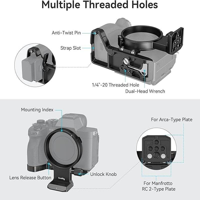 The SmallRig Rotatable Collar Mount Plate 4148 is a versatile accessory designed for Sony Alpha 7R V, Alpha 7 IV, Alpha 7S III, and Alpha 7R IV cameras, offering an efficient solution for quickly switching between horizontal and vertical shooting modes. This mount plate allows users to rotate the camera 90 degrees with the simple turn of a knob, eliminating the need for disassembly, realignment, or adjustments, ensuring smooth transitions between orientations. It securely locks the camera using a 1/4"-20 screw and an anti-twist pin, while also providing full access to the camera's LCD flip screen and ports. The mount plate is compatible with Arca-type and Manfrotto RC2 tripods, offering greater flexibility for different setups. The design also includes built-in pads to prevent scratches and twisting, ensuring your camera stays safe and secure during use. Additionally, the mount features multiple 1/4"-20 threaded holes, providing additional mounting options for accessories such as handles, and a strap slot for easy wrist strap attachment. The kit includes a quick-release plate and a magnetic double-head wrench, simplifying installation and removal. However, please note that this product is not compatible with certain Tamron lenses or Sony compact lenses, and it is not recommended for use with gimbals due to balance concerns. Weighing just 185g, this lightweight and compact mount plate is the perfect addition for content creators, photographers, and videographers who need a reliable, flexible solution for both horizontal and vertical shooting with their Sony Alpha series cameras.