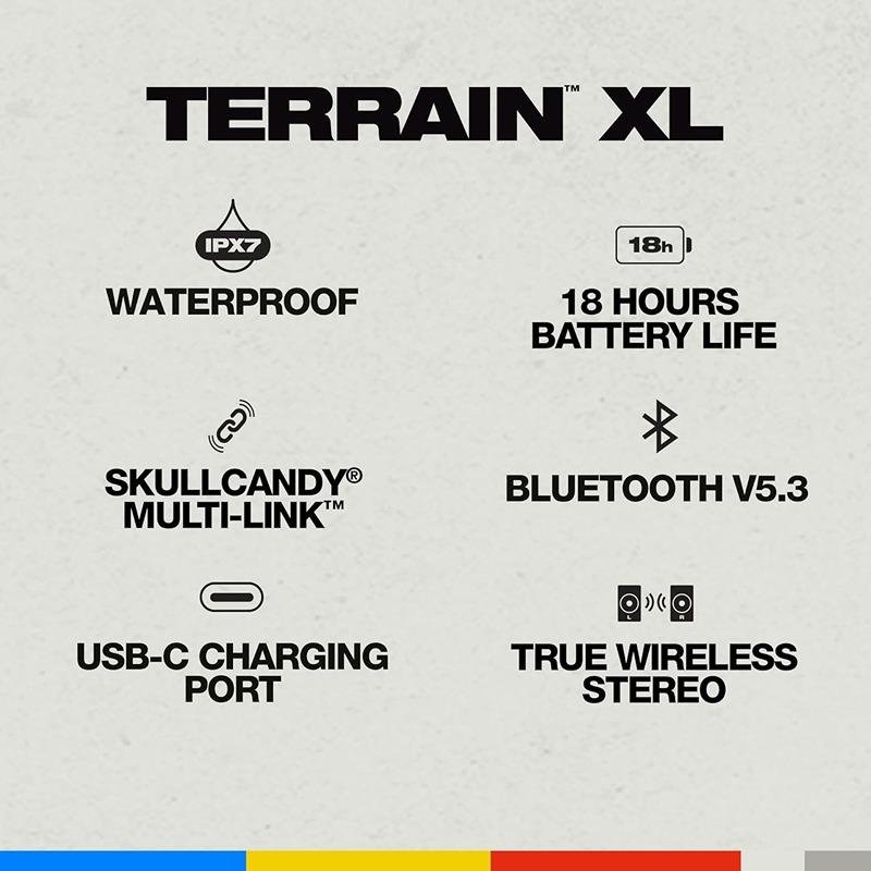The Skullcandy Terrain XL Wireless BT Portable Speaker in Bone/Orange Glow (2SKSK1848I0L2) is designed for outdoor enthusiasts who demand rugged durability and exceptional sound. Whether you’re gathering around a bonfire on the beach, cooling down after a long hike, or gearing up for a pre-game tailgate, this adventure-ready speaker will meet the challenge. Its waterproof construction ensures it stands up to the elements, so you can take it anywhere without worry. Equipped with Bluetooth v5.3, the Terrain XL provides a fast, reliable connection and features 18 hours of battery life, ensuring non-stop music during all-day outdoor adventures. Thanks to Skullcandy® Multi-Link™ technology, you can pair multiple speakers together to enhance your audio experience, and with True Wireless Stereo (TWS), you can sync two Terrain XL speakers for immersive, expansive sound. The 95dB sound pressure level and dual 48mm drivers deliver clear, powerful sound, while the USB-C charging port ensures fast and efficient charging. Whether you’re camping, hiking, or tailgating, the Terrain XL is your ultimate portable speaker for every outdoor occasion.