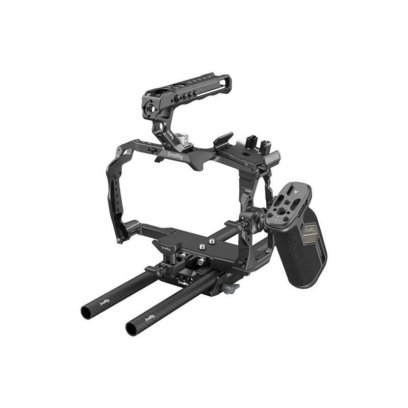 The SmallRig 4575 Advanced Cage Kit for Blackmagic Design Cinema 6K is a comprehensive solution designed to enhance the functionality and protection of your camera, making it an essential accessory for professional filmmakers. This robust cage system features a secure three-point locking mechanism with two 1/4"-20 screws at the bottom and one on top, ensuring that your Blackmagic Design Cinema 6K stays securely mounted. The integrated silicone pads protect the camera body from scratches, while full access to all camera interfaces, including the foldable screen, card slots, and battery compartment, allows for seamless operation without obstruction. This cage is compatible with Sigma MC-31 and MC-21 lens adapters, providing additional protection for the camera's lens mount. It also includes HDMI and USB-C cable clamps to prevent cable strain and signal loss. The ergonomic ARRI-type top handle offers comfort when shooting at low angles, while the flexible NATO side handle allows for easy repositioning and versatile shooting angles. The kit also includes an SSD mount that supports Samsung T5/T7 SSDs and provides a convenient accessory shoe mount for quick attachment and removal. Dual 15mm rods and a baseplate are included for mounting additional accessories such as a matte box, follow focus, and battery plates. With multiple mounting options, including 1/4"-20, 3/8"-16 threaded holes, ARRI mounting holes, NATO rail, and QD mounts, this cage kit ensures that you can customize your rig to suit any shooting style. Designed specifically for the Blackmagic Design Cinema 6K, the SmallRig 4575 Advanced Cage Kit maximizes the potential of your camera, offering stability, versatility, and protection.