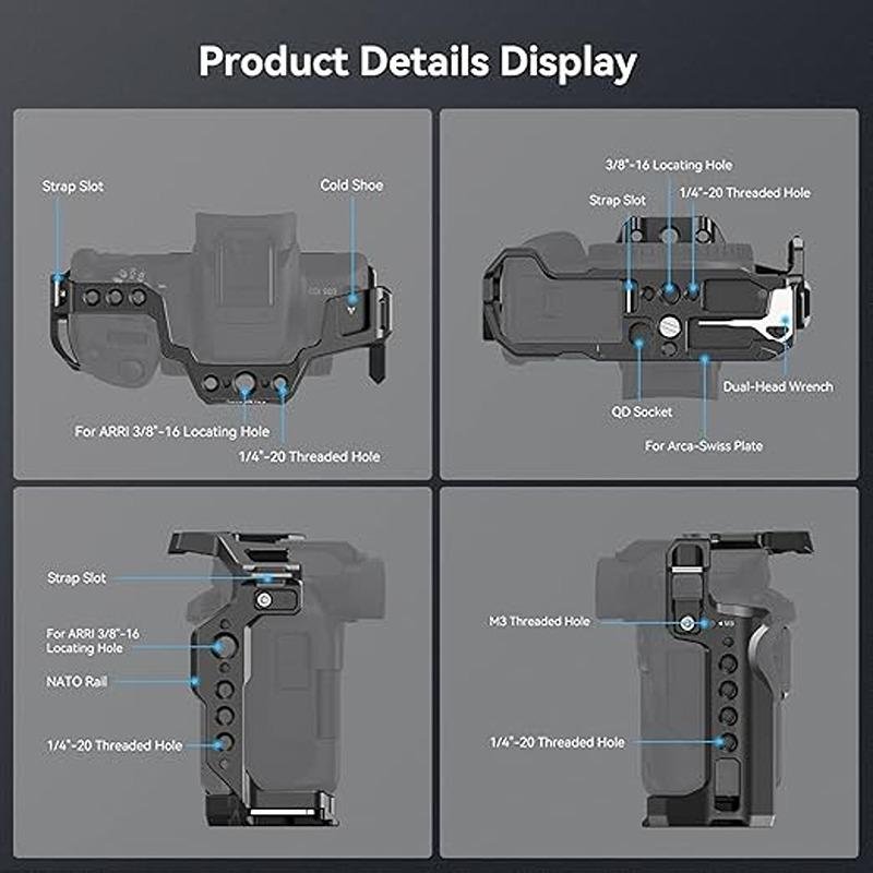 The SmallRig Cage for Canon EOS R50 (4214) is a robust and versatile solution designed to provide protection and expand accessory mounting options for the Canon EOS R50 camera. The cage securely locks the camera in place with a 1/4”-20 screw at the bottom and two side lock adapters, ensuring a firm fit. Rubber pads are included to prevent scratches and offer additional protection. The cage is designed to provide full access to all camera controls, card slots, the flip screen, and the battery door, allowing for uninterrupted functionality. This cage includes multiple accessory mounting points: 1/4”-20 and 3/8”-16 threaded holes, as well as ARRI 3/8”-16 locating holes, which enable the attachment of a Top Handle (3765), Side Handle (2093C), Monitor Mount (2903B), and Magic Arm (3875). The top cold shoe mount is perfect for attaching microphones (3468) or LED video lights (3286B), while the left NATO rail fits Rotating Side Handles (3260, 3813). The cage also features a built-in 1/4”-20 threaded hole on the right side for a cable clamp (1693) and a QD socket for a quick-release shoulder strap buckle. The integrated bottom Arca-Swiss quick-release plate allows for easy transitions between handheld, tripod, and gimbal (DJI RS 2 / RSC 2 / RS 3 / RS 3 Pro) shooting. A screwdriver is conveniently included to make assembly and disassembly a breeze, ensuring that you are always ready to shoot with ease. This lightweight and durable cage offers excellent protection while maximizing the potential for creative filming setups.