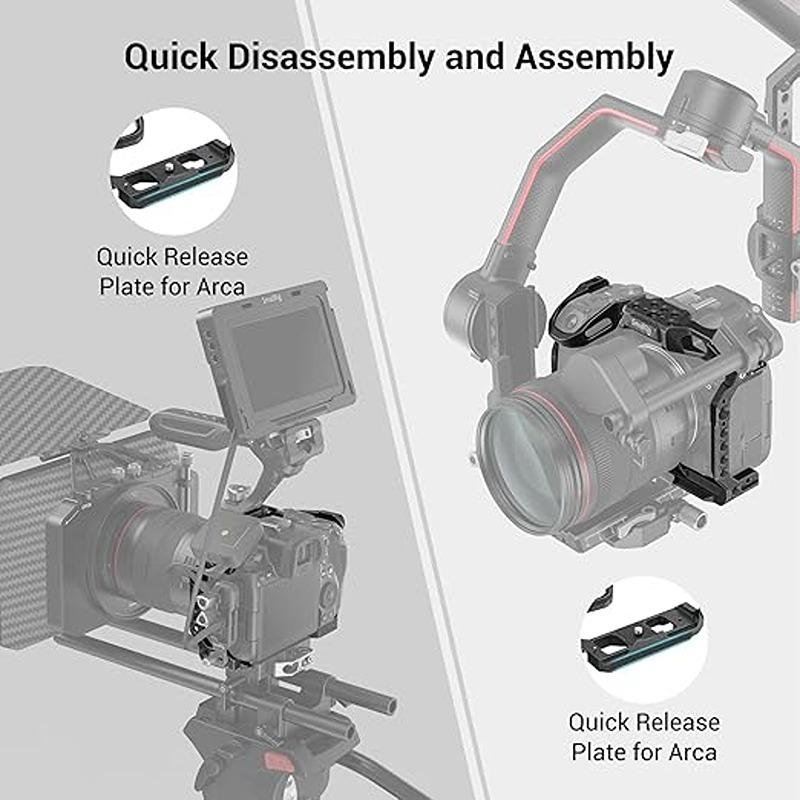 The SmallRig EOS R5 & R6 “Black Mamba” Cage 3233 is a high-quality, form-fitting camera cage designed specifically for the Canon EOS R5 and R6. This cage offers robust protection for your camera while providing convenient access to all controls, ensuring that you can operate your camera freely without obstruction. The cage securely locks the camera in place using a 1/4-20 screw and two locating pins, preventing any twisting or accidental movement. It features a sleek design with well-defined contours around the grip, ensuring a comfortable and secure hold. Multiple accessory mounts are available, including ARRI locating holes, 1/4"-20 and 3/8"-16 threaded holes, and a cold shoe mount, allowing you to attach a variety of essential accessories like handles, microphones, lights, and more. The cage’s integrated Arca-Swiss plate on the bottom offers seamless tripod compatibility, while strap holes provide a convenient attachment point for hand straps or neck straps, enhancing the stability of your rig during shooting. To make assembly and disassembly even easier, the cage comes with a built-in screwdriver at the bottom. Whether you are a professional or an enthusiast, the SmallRig EOS R5 & R6 Black Mamba Cage provides a versatile, durable, and efficient solution for your camera rig needs, ensuring that your gear remains safe and accessible during all of your video productions.