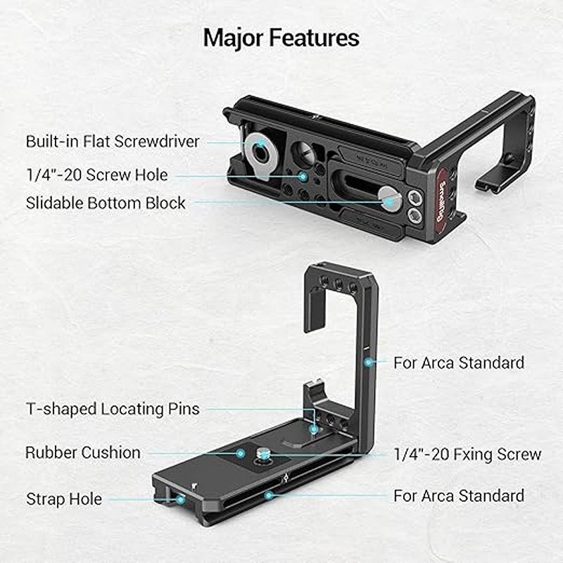 The SmallRig L-Bracket for Canon EOS R5 and R6 (2976) is a high-quality and versatile mounting solution designed to provide greater flexibility and stability for your camera setup. Specifically tailored for the Canon EOS R5, R6, and R6 Mark II, this L-bracket ensures secure and precise attachment with its 1/4”-20 screw on the camera base, preventing any wobbling thanks to an added anti-twist pin. Ideal for photographers and videographers, this bracket allows for quick orientation changes between horizontal and vertical shooting without the need to remove the camera from the tripod or gimbal. Both the side plate and base plate are Arca-compatible, ensuring quick and seamless transitions between different setups. The L-bracket is carefully designed to fit the Canon EOS R5 and R6 models, with no interference to the buttons, ports, LCD screens, or battery switches. Additionally, the side plate is extendable by 22.5mm, offering extra space for cable management, ideal for preventing cables from interfering with your shooting. The bracket also includes 1/4”-20 accessory threads, which enable you to attach additional accessories like the SmallRig cable clamps (2259 for EOS R5, 1822 for EOS R6) or a cold shoe mount (BUC2736). Lightweight and durable, the SmallRig L-Bracket 2976 is perfect for users seeking a solid, well-designed, and flexible solution for their Canon EOS R5 and R6 cameras.