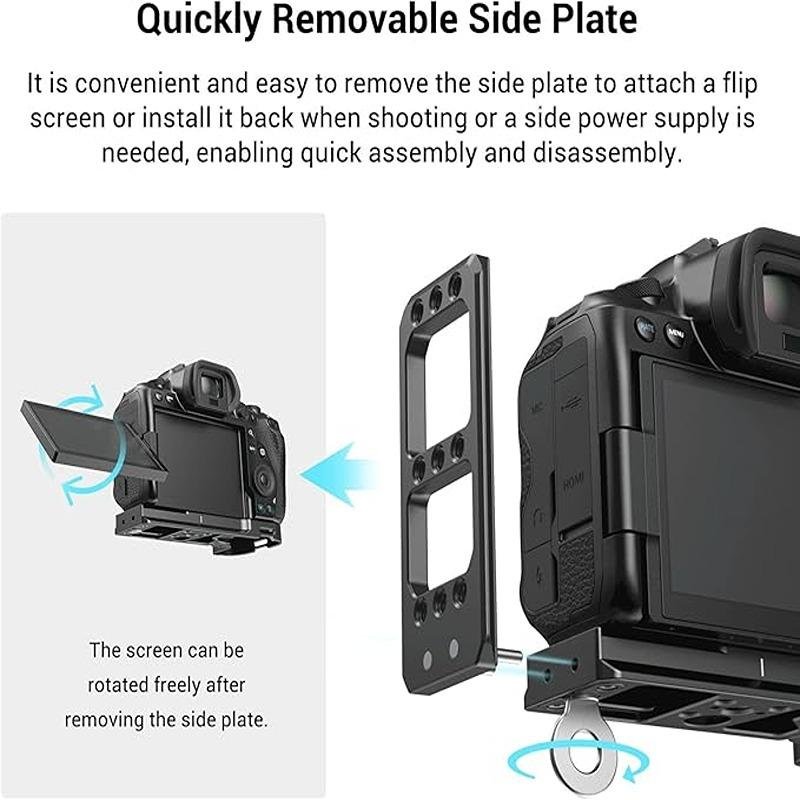 The SmallRig QR L-Bracket for Canon EOS R5/R6/R5 C (3659) offers a sleek, ultra-slim design that minimizes the weight burden for photographers on the move, making it an ideal companion for outdoor shoots, such as hiking or climbing. This L-bracket combines lightweight portability with full functionality, allowing users to effortlessly switch between different shooting setups. Its innovative design includes a removable side plate, which enables easy attachment of a flip screen or side power supply, offering convenience for quick assembly and disassembly. The bottom plate is designed to perfectly fit the camera, providing a comfortable and secure grip for added stability while shooting. Additionally, the integrated Arca structure on both the base and side plates allows seamless transitions between different mounting systems, such as tripods, stabilizers (like the DJI RS 2/RSC 2), or handheld shooting. The bracket also features a spindle spanner that fits the camera’s battery door curve, enhancing the overall grip experience. Furthermore, it is equipped with a built-in magnetic spanner, making assembly and disassembly even more convenient. Whether you're shooting in the studio or on the go, this L-bracket provides an efficient and practical solution for all your photography needs.