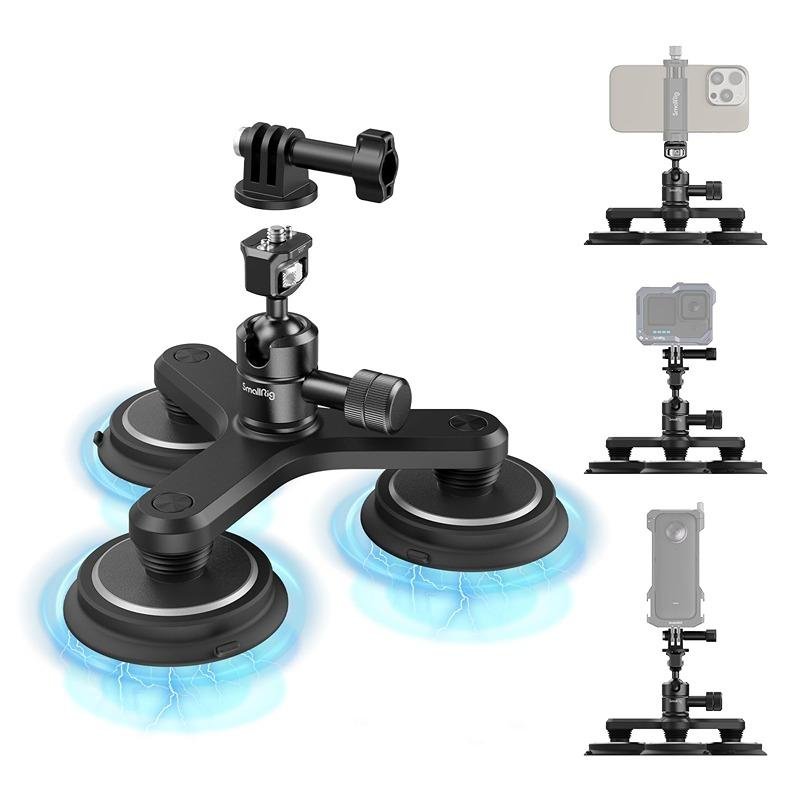 The SmallRig Triple Magnetic Suction Cup Mounting Support Kit for Action Cameras 4468 is designed for stable and secure action camera mounting on flat iron surfaces, such as car doors, railings, kitchenware, or sports equipment, making it ideal for shooting high-speed car scenes. This innovative kit features a dual-material design that combines the powerful pull of magnets with silicone suction, providing a six times stronger attachment than standard mounts. In case of air leakage from the silicone suction cup due to strong vibrations, the magnet ensures that the entire bracket remains securely attached to the surface, effectively preventing any risk of falling off. The kit also includes a magic arm with rubber pins that fit into the locating holes of action camera mounts, ensuring a secure and stable connection. With easy-to-use release tabs for quick disassembly, the SmallRig 4468 kit is perfect for high-speed, dynamic shooting situations. It supports mounting action cameras, monitors, LED video lights, microphones, and other accessories with its 1/4"-20 screw on one end. This system is compatible with SmallRig 3084C, 3083C, 4088B, 4119B, and other accessories that have locating holes to prevent deflection and ensure safety. With a load capacity of 0.35kg/0.8lb in dynamic shooting scenarios (with a maximum speed of 120km/h or 74mph), this kit is an excellent solution for stable, high-quality shooting on cars or other flat iron surfaces.