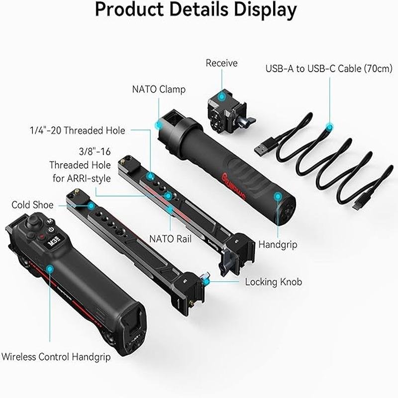 The SmallRig Wireless Control Dual Handgrip 3954 is designed exclusively for DJI RS 2 and RS 3 Pro gimbals, offering users a stable, two-handed support system for smoother and more controlled footage. The dual aluminum handgrip mounts securely onto the gimbal with its dual NATO rail system, providing flexibility in positioning and allowing for both traditional and underslung shooting modes. This handgrip comes with a wireless receiver that offers remote control of your gimbal from up to 328 feet (100 meters) away, enabling precise joystick control, mode switching, and centering/locking functions, all at the touch of a button. The receiver is powered by a built-in battery, which provides up to 10 hours of usage, and can be easily charged via the included USB cable. With a modular design, this handgrip can also be paired with the SmallRig wireless controller 3920 for additional functionality. Its dual NATO rail allows the handgrip to be inverted for underslung mode, and the adjustable width ensures comfort for all users. Additionally, it is equipped with several mounting points, including 1/4"-20 and 3/8"-16 threaded holes, and cold shoe mounts, allowing you to attach a variety of accessories such as monitors, microphones, lights, or a smartphone holder. The handgrip also features a soft silicone grip for added comfort during long shoots and can support a maximum load capacity of 8kg (17.6 lbs), making it a highly versatile tool for professional filmmakers and content creators.