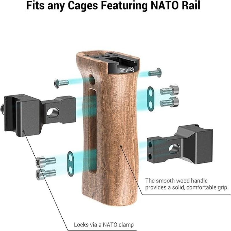 The SmallRig Wooden NATO Side Handle 2187 is an essential accessory designed to enhance your handheld shooting experience. It fits any cage with NATO rails on both sides, allowing for quick and tool-free attachment and detachment, making it ideal for fast-paced shooting environments. The handle features mounting holes and a cold shoe on top, enabling you to attach various accessories like microphones, lights, or monitors directly onto the handle for a more streamlined setup. Designed for comfort and durability, the handle combines a one-piece aluminum inner structure with a wooden outer layer, offering a lightweight yet sturdy design for comfortable extended use. The built-in Allen key allows you to adjust the direction and height of the handle, offering flexibility to customize your grip based on shooting preferences. Whether you’re shooting for long hours or in tight spaces, this ergonomic handle ensures a steady and balanced shot, reducing the strain on your arms. The combination of aluminum and wood makes it both functional and aesthetically pleasing, adding a touch of elegance to your camera rig. With its compact size and easy installation, the SmallRig Wooden NATO Side Handle 2187 is perfect for photographers and videographers seeking a reliable, comfortable, and adaptable solution for handheld shooting.