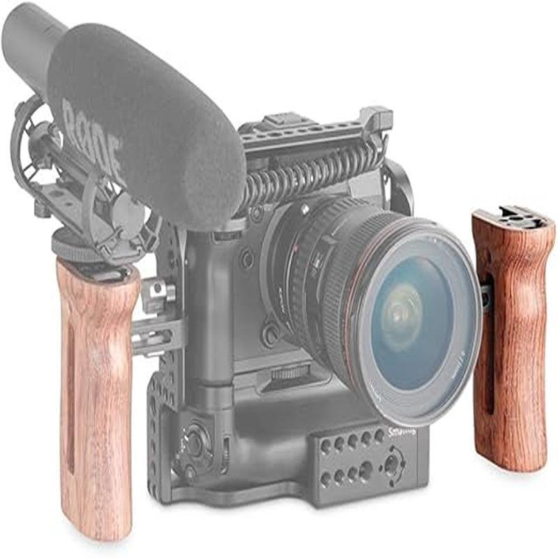 The SmallRig Wooden Universal Side Handle 2093 is a versatile and ergonomic accessory designed to enhance handheld shooting experiences. It is compatible with any cage that features two 1/4" threaded holes spaced 18mm apart, including popular SmallRig cages such as the A7RIII Cage 2087, GH5 Cage 2049, A6500 Cage 1889, and A6300 Cage 1661. The handle is made from natural rosewood, offering a comfortable, organic feel that enhances the grip during long shooting sessions without the need for painting. This wooden handgrip is secured with two thumb screws for a firm, reliable attachment. Its design includes a cold shoe mount on top for attaching accessories like microphones and lights, along with additional 1/4" and 3/8" threaded holes that allow for further accessory mounting options such as a magic arm or ball head for a monitor. At just 200 grams, the handle provides an effective yet lightweight solution to increase stability during handheld filming, while the ergonomic shape ensures maximum comfort for the user, making it an excellent addition to any filmmaker’s gear.