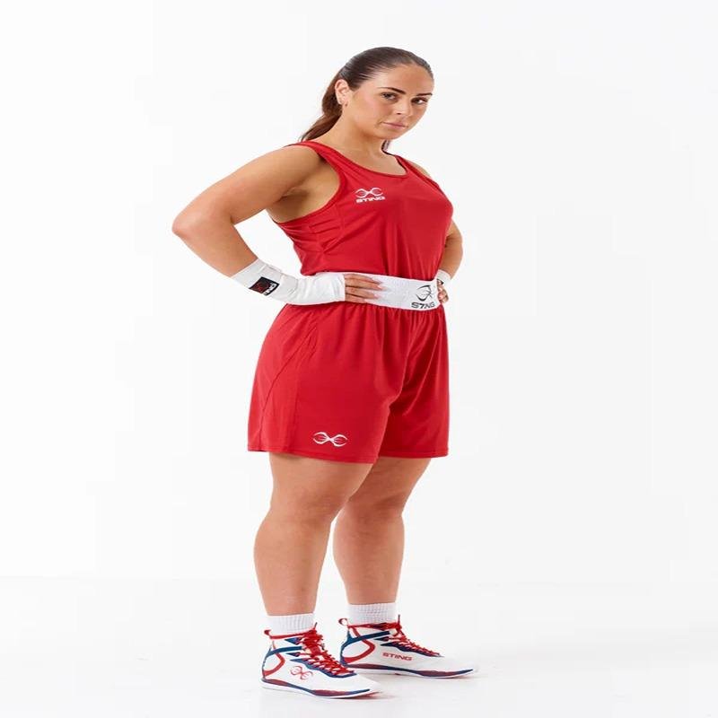 The STING Female Boxing Mettle Singlet in red, size M (W-ST1043-R02), is engineered to provide boxers with a perfect combination of comfort, style, and performance. Made from high-quality 100% polyester interlock material, the singlet offers superior durability and breathability, ensuring athletes stay cool and dry even during intense workouts. Its lightweight and breathable design enhance performance, allowing boxers to focus on their training without distractions. The athletic cut provides full range of motion, enabling quick movements and powerful punches without restriction. This singlet is built to withstand the challenges of both training and competition, thanks to its durable construction that promises long-lasting performance. The modern and sleek red design boosts confidence in the ring, allowing boxers to express their style while maintaining functionality. The singlet’s moisture-wicking properties keep athletes dry, while the diamond weave fabric provides excellent climate control, helping regulate body temperature to keep boxers comfortable during intense training sessions. Designed specifically for female athletes, this singlet offers an ideal fit that promotes freedom of movement and prevents irritation, ensuring that boxers can train and compete with ease. Whether for practice or competition, the STING Female Boxing Mettle Singlet in red provides the ultimate balance of performance, comfort, and durability, making it an essential part of any boxer’s gear.