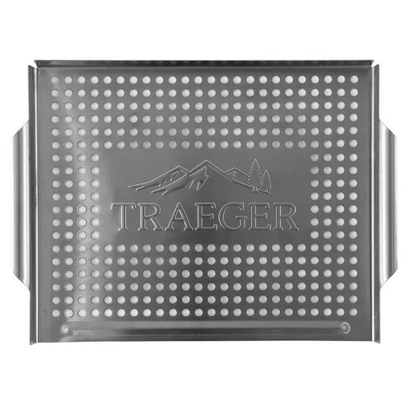 The TRAEGER STAINLESS GRILL BASKET - BAC585 is the ultimate solution for grilling small or delicate foods like chopped vegetables, shrimp, and other small items with ease. Designed with stainless steel for durability and even heat distribution, this grill basket ensures your food cooks perfectly without the risk of losing it through the grates. The small, strategically placed holes allow heat and smoke to circulate evenly around the food, delivering that signature smoky flavor while preventing the food from falling through the grill. The raised edges of the basket keep your ingredients secure, preventing them from rolling off the grill, even when tossing or flipping them. Whether you're grilling vegetables, seafood, or small cuts of meat, this basket offers the perfect way to expand your grilling possibilities. Its spacious 15.75” x 11.5” size accommodates a variety of foods, making it a versatile tool for any grilling enthusiast. With this high-quality, easy-to-use stainless steel grill basket, you can confidently cook small or finely chopped foods on the grill without any mess or hassle. The Traeger Stainless Grill Basket is the perfect addition to your grilling toolkit for an elevated outdoor cooking experience.