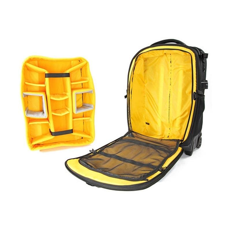 The Vanguard ALTA FLY 62T Rolling Backpack Trolley is the ultimate solution for professional photographers and videographers who need a versatile, secure, and highly functional bag for their gear. Designed to carry 2-3 Pro DSLRs, 7-11 lenses (up to 300mm f/2.8), a flash, accessories, and even a drone with its related items, this trolley bag is spacious and customizable for all your needs. It also offers dedicated compartments for a 17” laptop and a tablet, ensuring that you can carry all your electronics along with your camera equipment. The sturdy two-wheel trolley system makes transportation easy, while the ‘3 Security Point System’ ensures that your gear stays secure during travel with a buckle lock, external zippers, and an internal zippered mesh flap. The bag is equipped with dual-use dividers in dual colors, providing the flexibility to transport either camera gear or a drone setup. The interior is well-padded all around to protect your valuable equipment, while the numerous dedicated pockets and organizers keep everything in place for efficient use. The bag’s tripod carrying system ensures steady transport of your tripod, and it integrates seamlessly with the ALTA LINK system for use with the Vanguard ALTA Action Tripod Bag. Designed for the discerning photographer, the ALTA FLY 62T is fully protected from the elements with a total coverage rain cover. Whether you're on a photoshoot, traveling by plane, or working on location, this rolling backpack trolley ensures your gear is secure, organized, and ready for action.